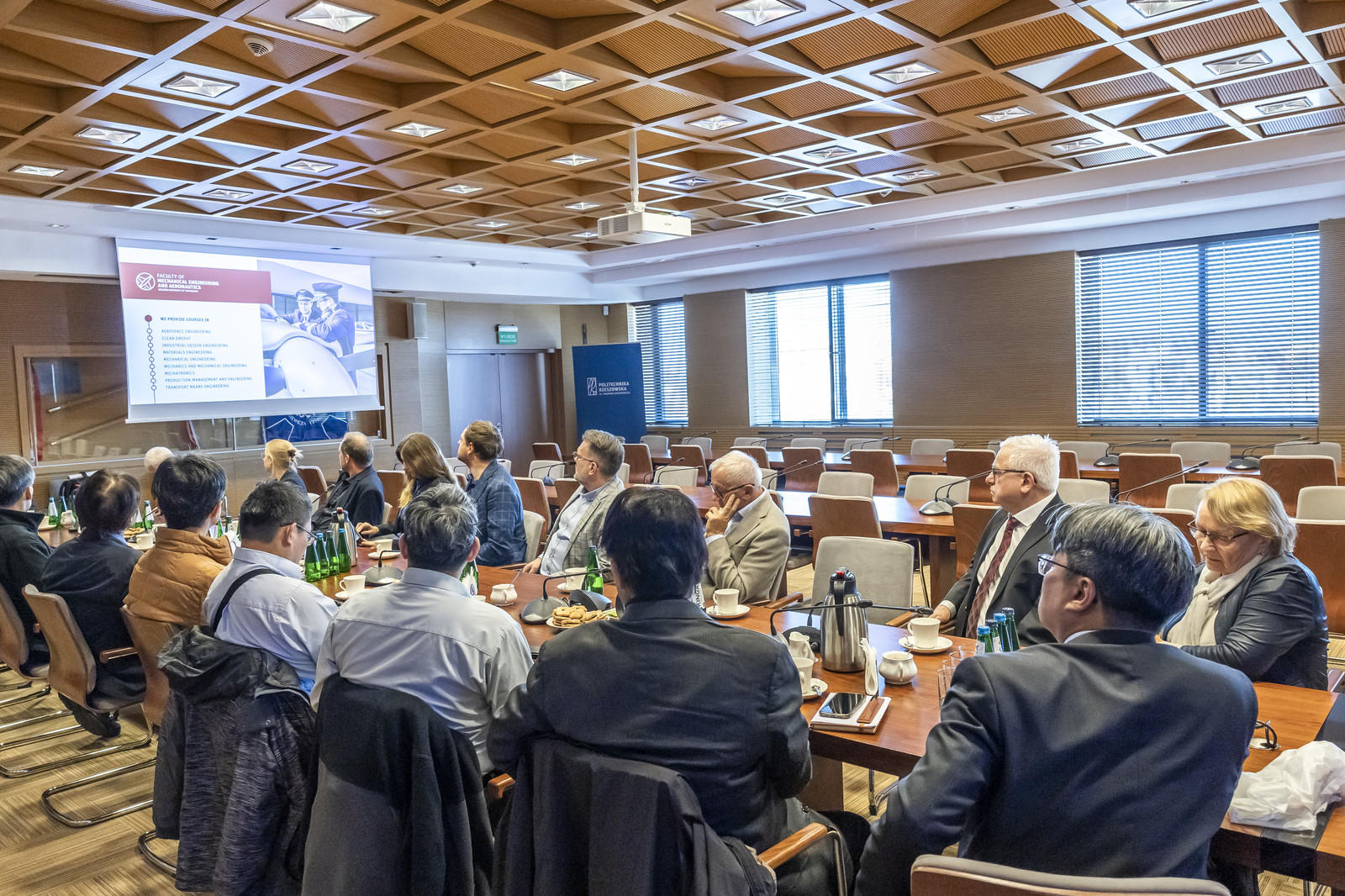 W Sali Senatu Politechniki Rzeszowskiej odbyło się spotkanie delegacji naukowo-przemysłowej z Tajwanu z przedstawicielami Politechniki Rzeszowskiej oraz firm lotniczych z Podkarpacia. Wydarzenie było okazją do wymiany doświadczeń i omówienia potencjalnych obszarów współpracy w dziedzinie zaawansowanych technologii lotniczych, systemów bezzałogowych oraz innowacyjnych rozwiązań dla przemysłu kosmicznego.