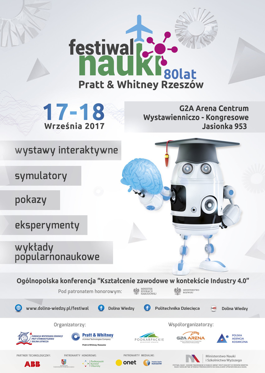 Od 17 do 18 września br. w G2A Arena (Centrum Wystawienniczo-Kongresowym w Jasionce) odbędzie się wielkie święto nauki. Tradycyjnie w tego rodzaju wydarzeniu, które ma na celu popularyzację najważniejszych osiągnięć naukowych i rozbudzenie zainteresowań kierunkami technicznymi, uczestniczy Politechnika Rzeszowska im. I. Łukasiewicza. Nasi reprezentanci wspólnie z innymi wystawcami zaprezentują się jak najlepiej potrafią, czyli od naukowej strony. Zapraszamy do odwiedzenia naszych stoisk: