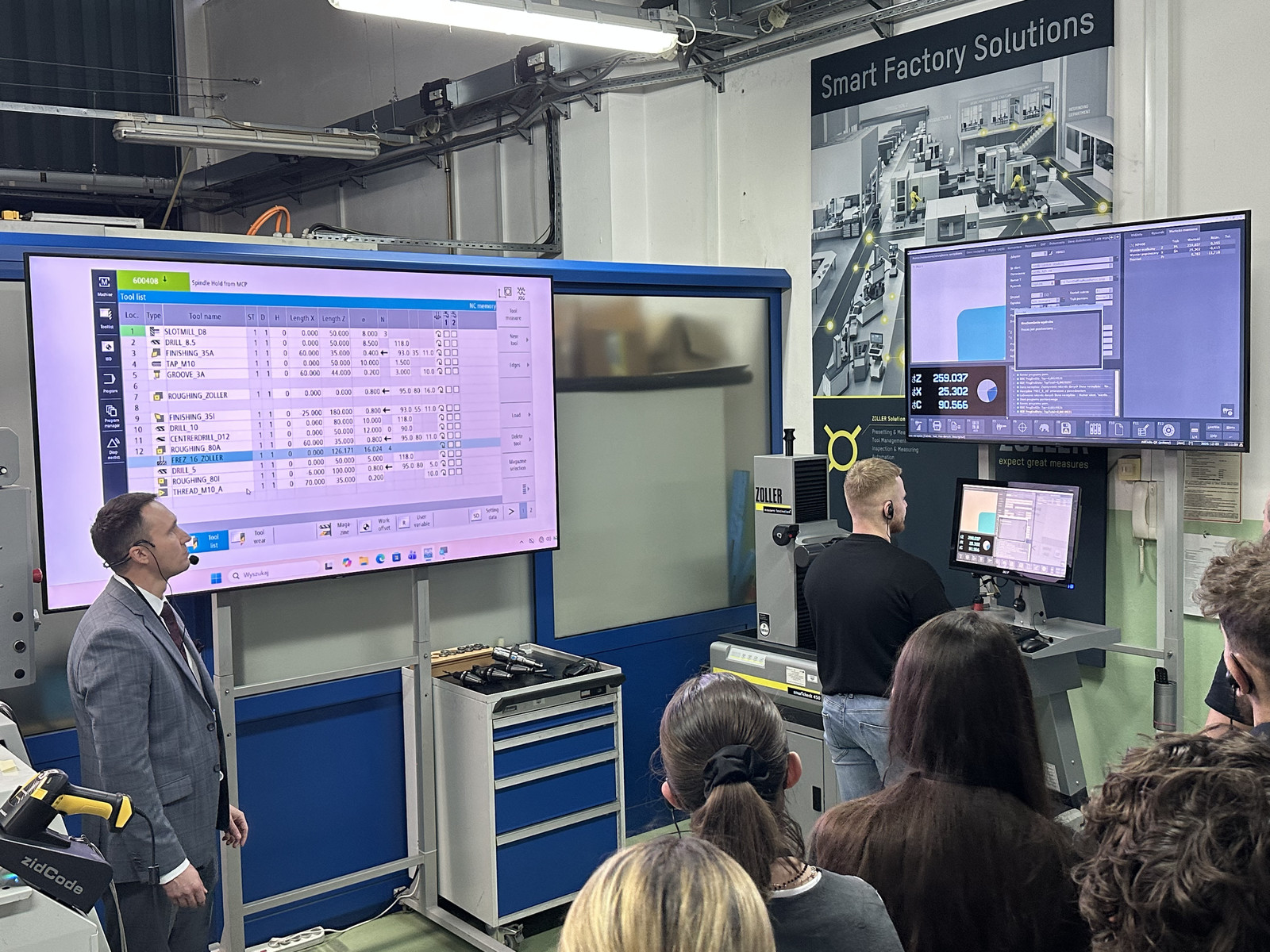 • pokazy automatycznego przesyłu danych narzędziowych bezpośrednio do obrabiarek CNC stanowiące integralny element zajęć demonstracyjnych i były realizowane z wykorzystaniem nowo wdrożonego w katedrze rozwiązania ZOLLER zidCode – przykłady przeprowadzono z zastosowaniem kodów QR, dedykowanego czytnika QR i systemu RunMyVirtualMachine, demonstrując praktyczne możliwości cyfrowej integracji systemów pomiarowych z procesami przygotowania i realizacji produkcji.
