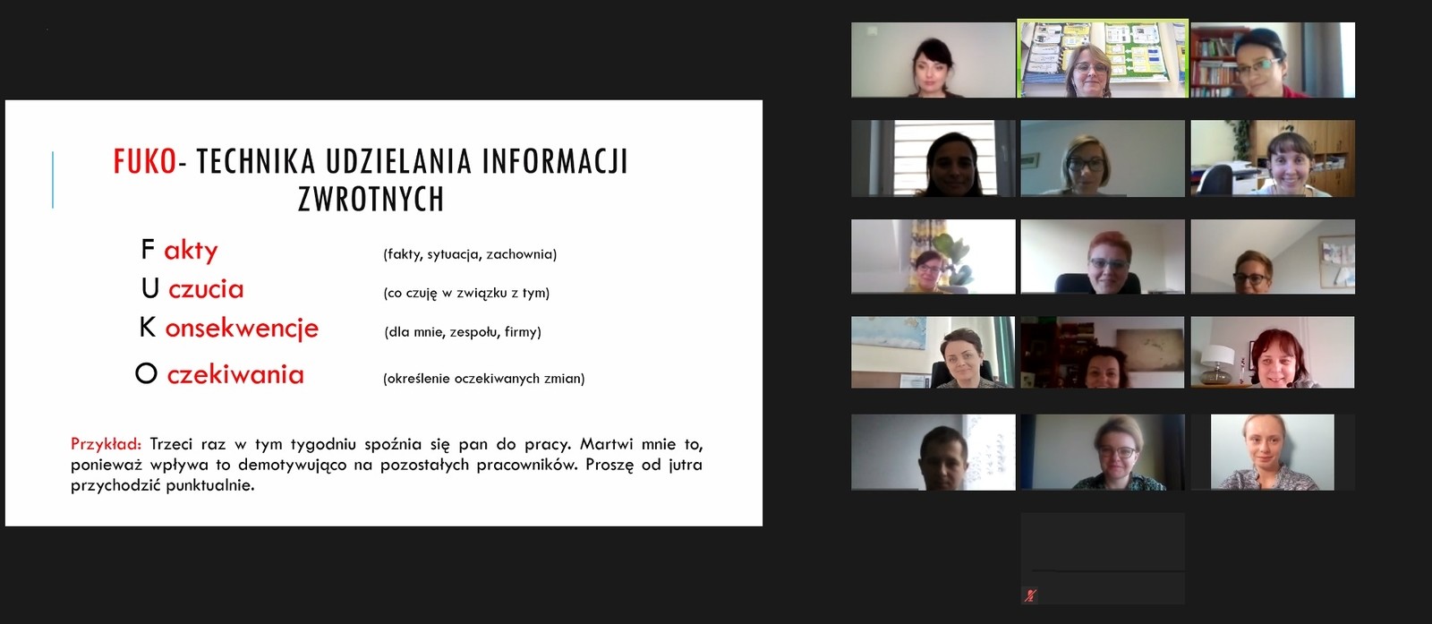 Pierwsza edycja szkoleń odbyła się 4 i 5 listopada br. O technikach radzenia sobie z agresją studenta oraz z własnymi emocjami w trudnych sytuacjach podczas pracy w administracji uczelnianej opowiadała Magdalena Pikulska z Centrum Szkoleń i Rekrutacji. W szkoleniu wzięło udział 30 pracowników z różnych jednostek organizacyjnych Politechniki Rzeszowskiej i różnych grup pracowniczych. W związku z panującą sytuacją pandemiczną szkolenia odbywają się wyłącznie w formie zdalnej.