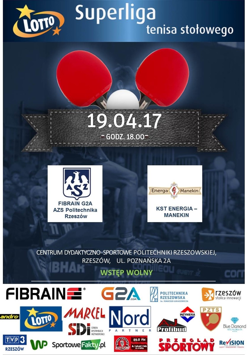 Drużyna tenisa stołowego Fibrain G2A AZS Politechnika Rzeszów 19 kwietnia br. rozegra mecz z Energą-Manekinem Toruń. Początek spotkania o godz. 18.00 w hali Centrum Dydaktyczno-Sportowego Politechniki Rzeszowskiej przy ul. Poznańskiej 2A (wstęp wolny).